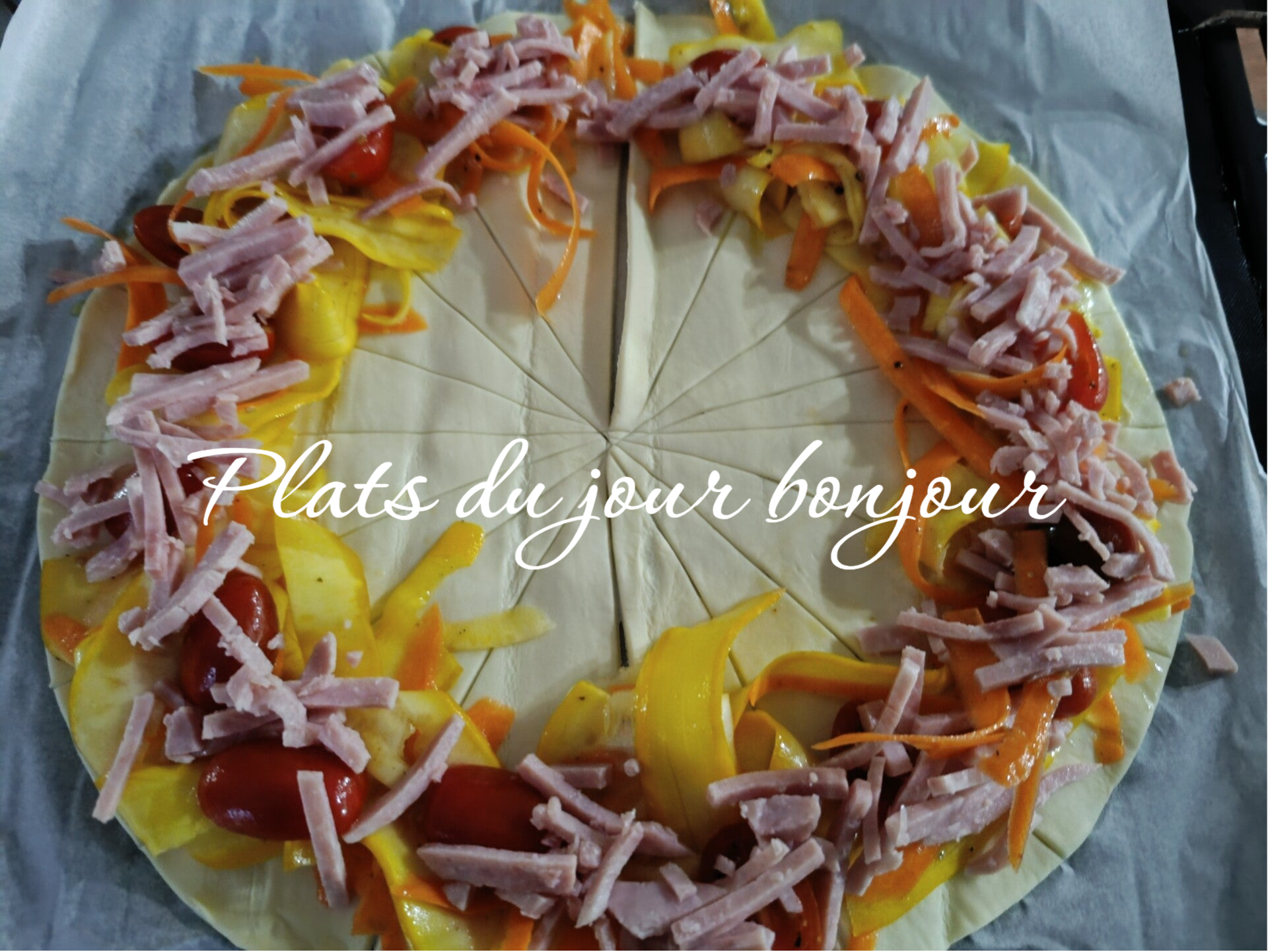Cette tarte sur la photo ci-dessus est avec 2 courgettes jaune moyen et 3 belles carottes et une poignée de tomates cerises .