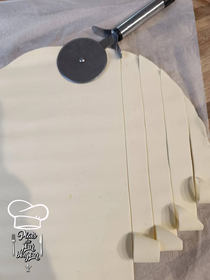 Étale la pâte et découpe la pâte en lanières. Ensuite fait comme sur la photo 📸
