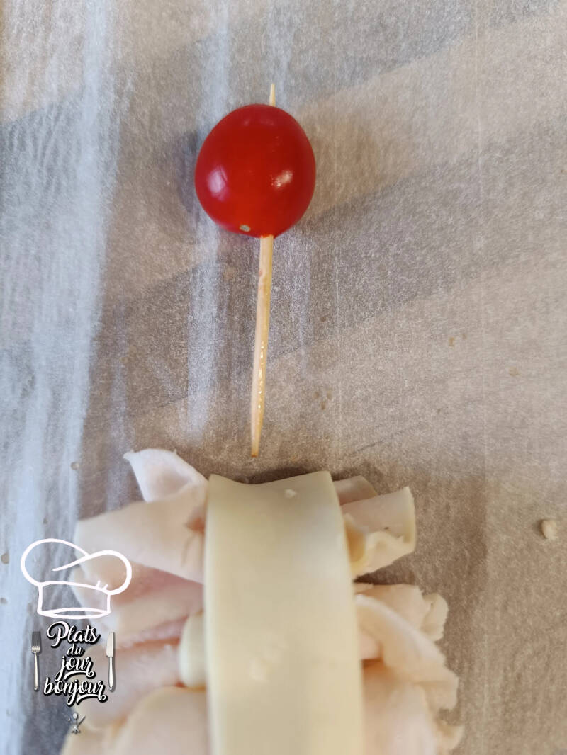 Une fois fait met une tomate cerise ou une olive sur un cure dent et traverse la pâte feuilletée déjà garnie.