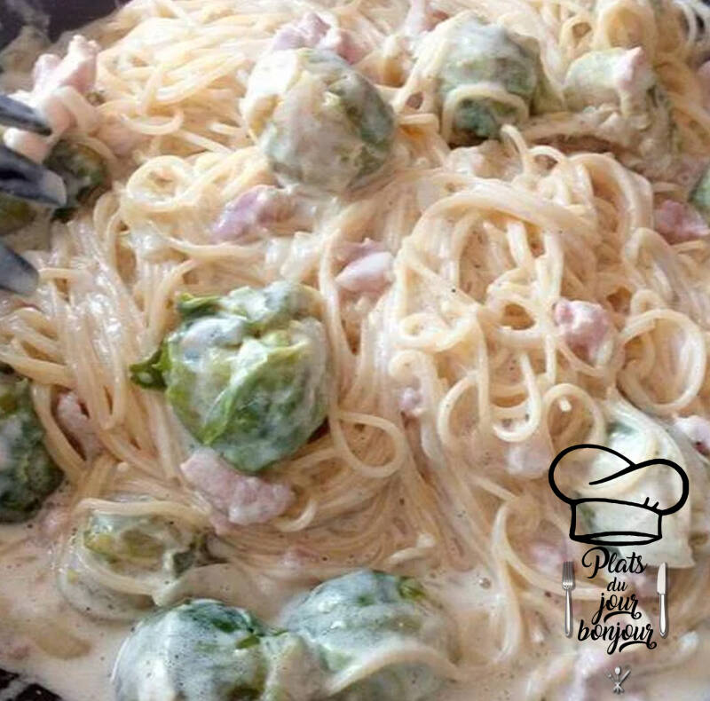 Déguste tes Spaghetti aux choux de Bruxelles crémeux et lardons bien chauds !