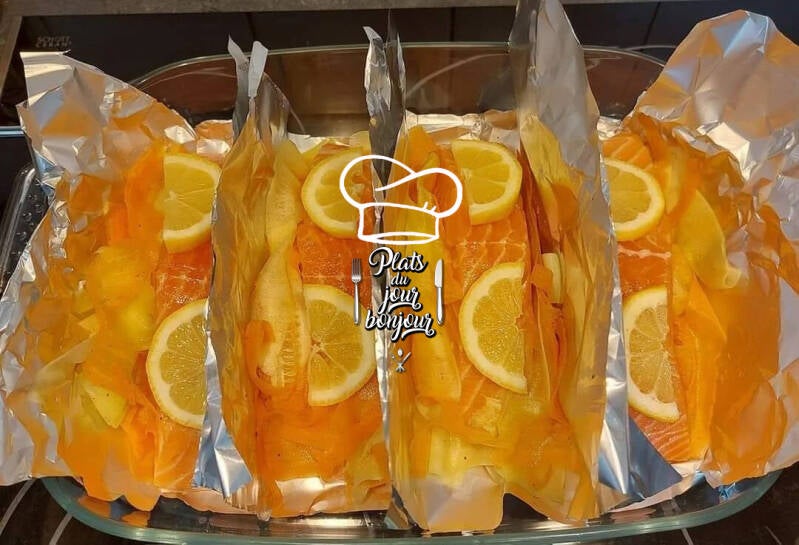 Dépose le pavé de saumon et une de rondelles de citron , un filet d’huile d’olive🫒 . Sale et poivre et referme les papillotes.
