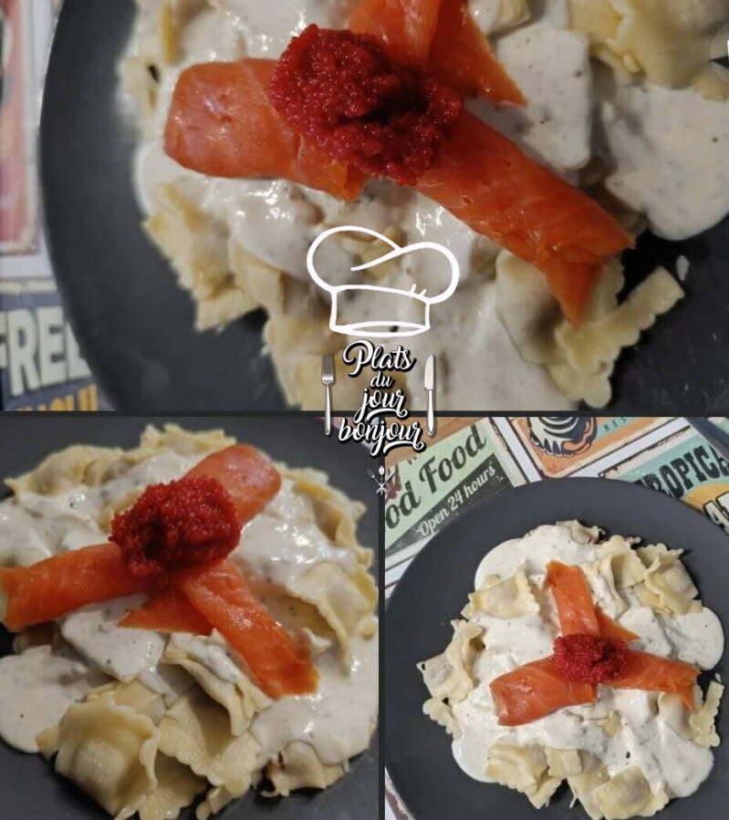 Sers les raviolis avec la sauce crémeuse et ajoute des tranches de truites fumée roulée et une belle cuillère à café d'œuf de lompe.