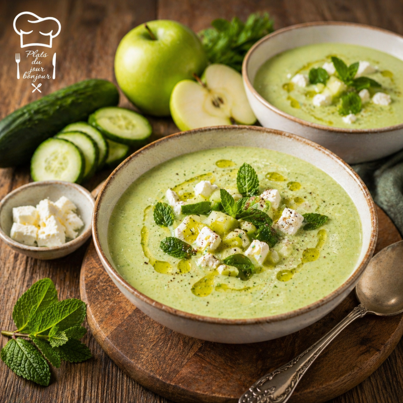 Tu vas adorer cette soupe froide au concombre, pomme verte et menthe : une recette estivale ultra rafraîchissante, légère et pleine de saveurs.