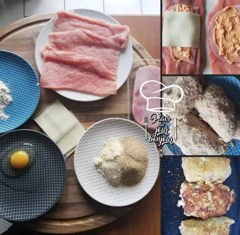 Sur chaque escalope, ajoute une belle cuillère de pesto ou de la tapenade et dépose une tranche de jambon, une tranche de fromage . Plie chaque escalope en deux pour enfermer la garniture.