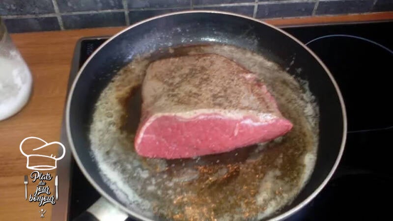 Saisis le rôti de bœuf dans une poêle bien chaude avec un peu d'huile d'olive et du beurre pour le dorer sur toutes les faces.