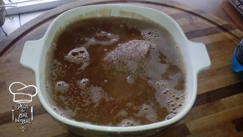 Quand le rôti et le jus est froid remet le rôti dans le jus pour faire mariner et laisse quelques heures dedans.