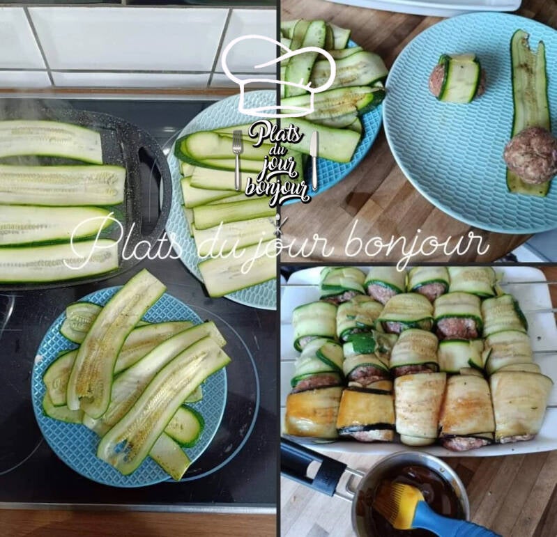 Forme des boulettes comme tu les prépare actuellement , attention pas trop grosse car elle risque de casser a la cuisson et ajouté les sur chaque lamelle de courgette et roule-les.