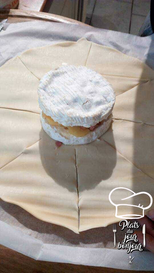Dans un plat allant au four, étale la pâte feuilletée. Coupe ton camembert en deux et place au centre.