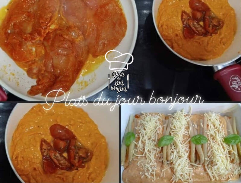 - 4 escalopes de poulet à faire doré à la poêle et les mettre dans un plat qui va au four. Moi je les ai marinés la veille avec un mélange d'épices italiennes avec un filet d'huile d'olive 🫒